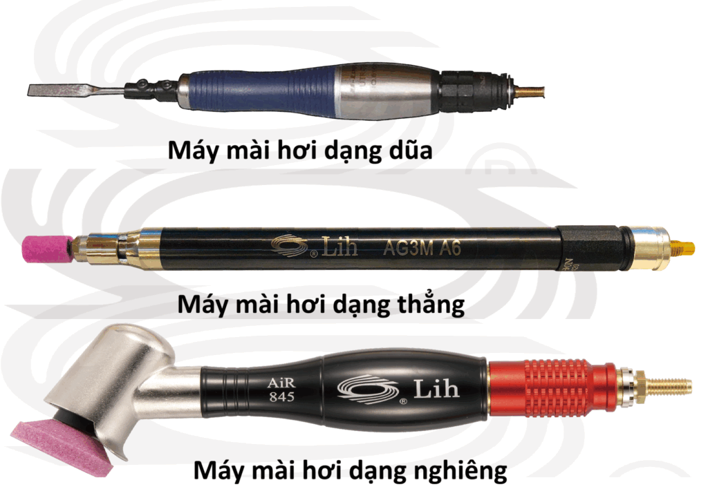 Máy mài hơi có một vài dạng chính như sau: dạng quay đầu thẳng, dạng quay đầu nghiêng và dạng dũa. Dạng quay đầu thẳng và nghiêng khá phổ biến trong đó đầu lắp đá thẳng hoặc nghiêng 90° hoặc 120° so với thân máy. Chúng được sử dụng để mài và đánh bóng bề mặt khuôn, chi tiết máy.