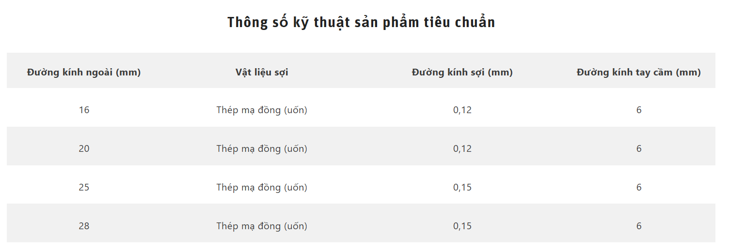 Chổi đánh bóng dạng này sử dụng sợi đồng có độ cứng cao dễ dàng tẩy rửa, đánh bóng, đánh bavia các loại vật liệu cứng. Bảng bên dưới thể hiện các dòng sản phẩm có sẵn đồng thời chúng tôi có thể tuỳ biến theo yêu cầu của khách hàng,